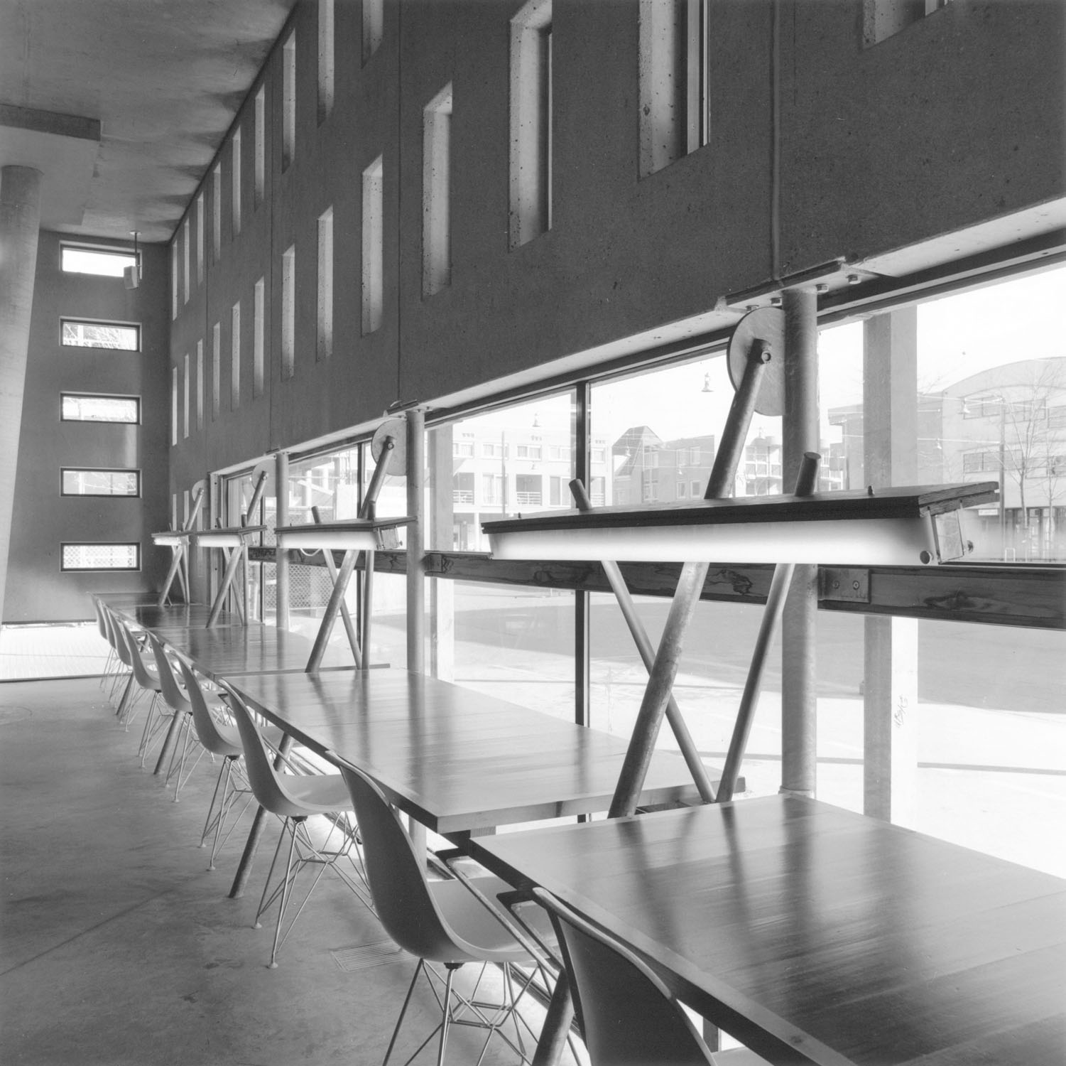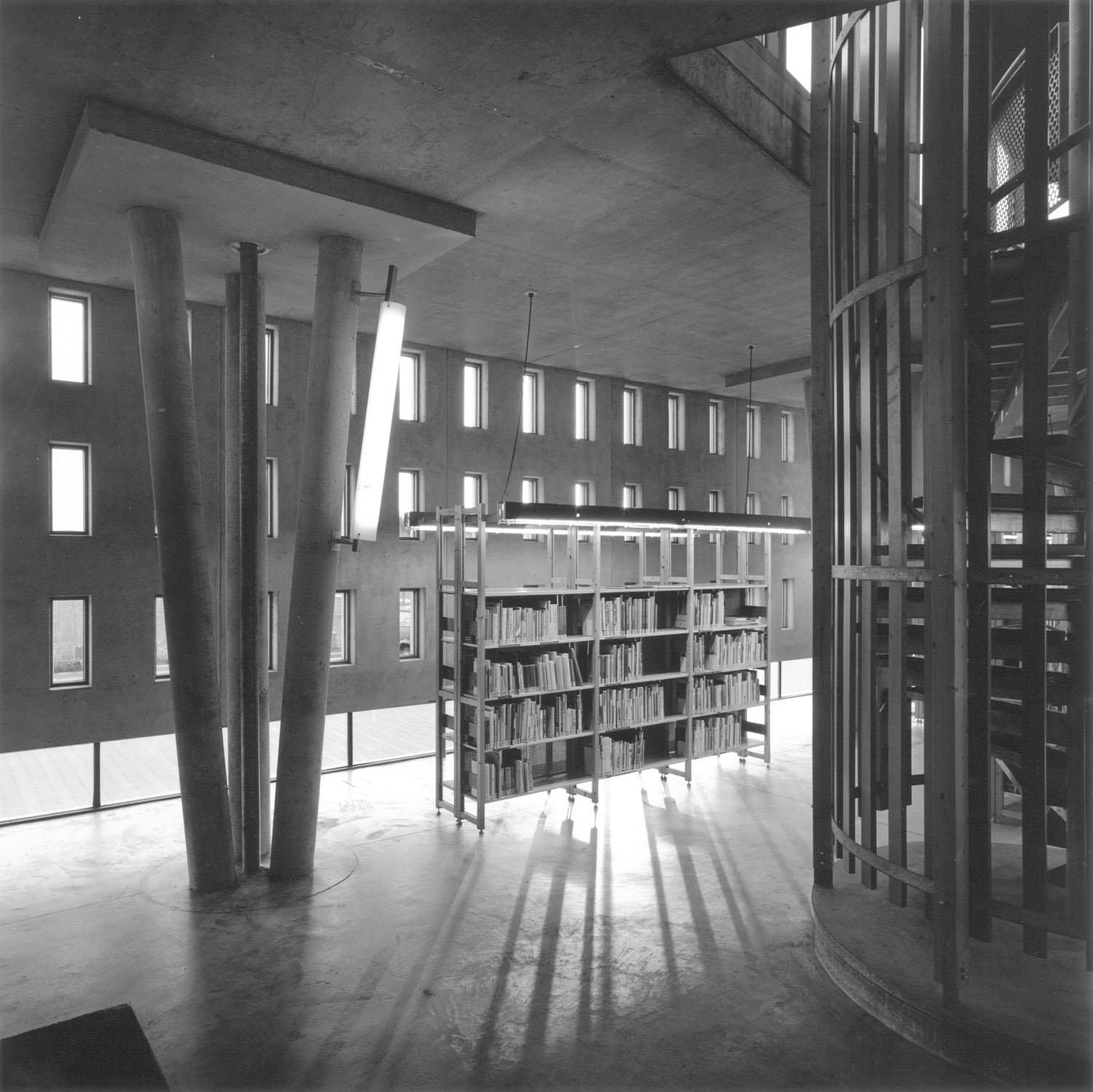 Het centrum van Zeewolde bestaat uit een plein met winkels aan een arcade. Om de bibliotheek hierbinnen te onderscheiden als openbaar gebouw, is de arcade vijf in plaats van twee meter diep gemaakt. De begane grond bevat een opstelling met boekenkasten, tussen de driepotige kolommen die telkens anders staan. Op de verdieping liggen de studie- en voorleesruimten, verbonden met het dakterras. De studieruimte zie je beneden al, omdat de vloer ervan door het plafond is gezakt. De bibliotheek is gemaakt van brute, pure materialen, passend bij dit pioniersdorp in de polder. Het gebouw heeft een zware gevel die lijkt te zweven boven