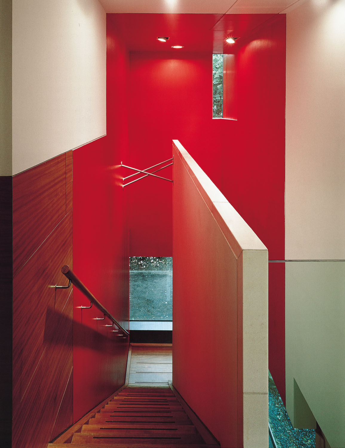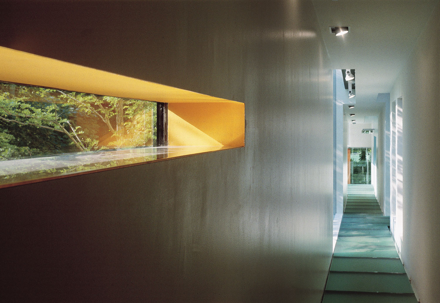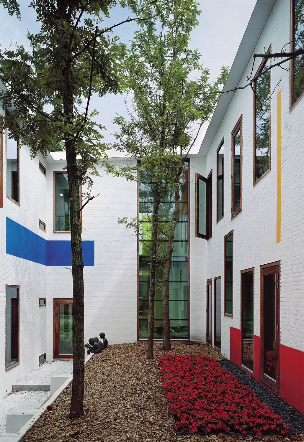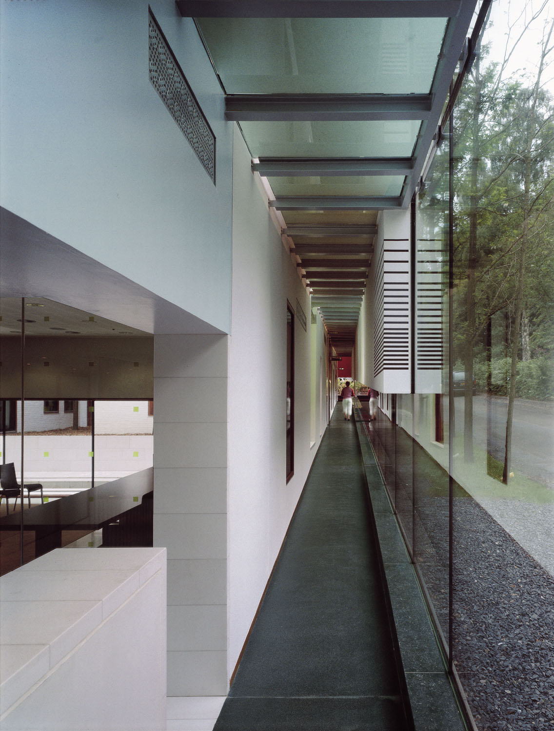 contour van het terrein. De verkeersruimten van het gebouw bevinden zich langs beide glazen gevels. De werkruimtes in het hart van het gebouw zijn gesitueerd rond de patio´s waardoor iedere ruimte direct zicht heeft op licht, lucht en natuur. De patiogevels zijn, in tegenstelling tot de strakke buitengevels van glas en metaal, gedifferentieerd gecomponeerd met verspringende ramen metselwerk gevelvlakken en verschillende kleurvlakken.