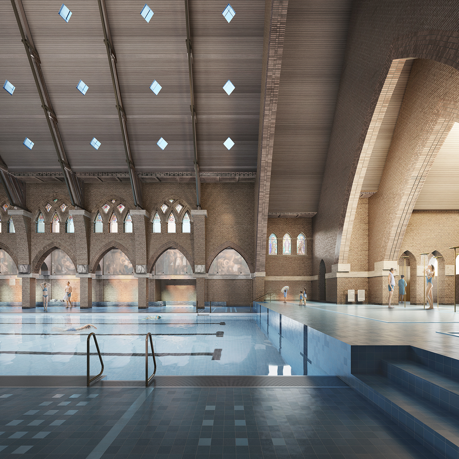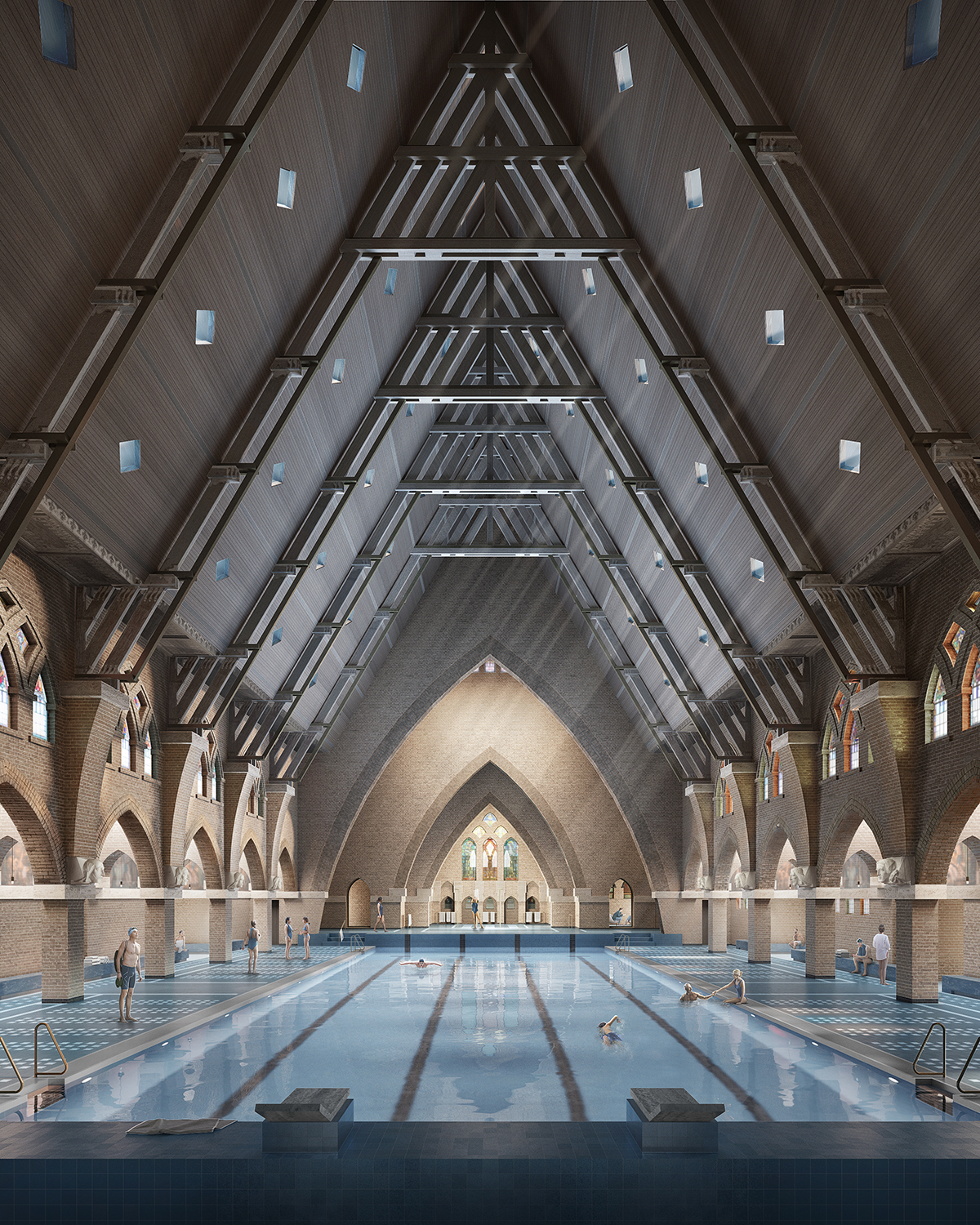 met de expressieve houten spant constructie. Het stadsbad heeft een