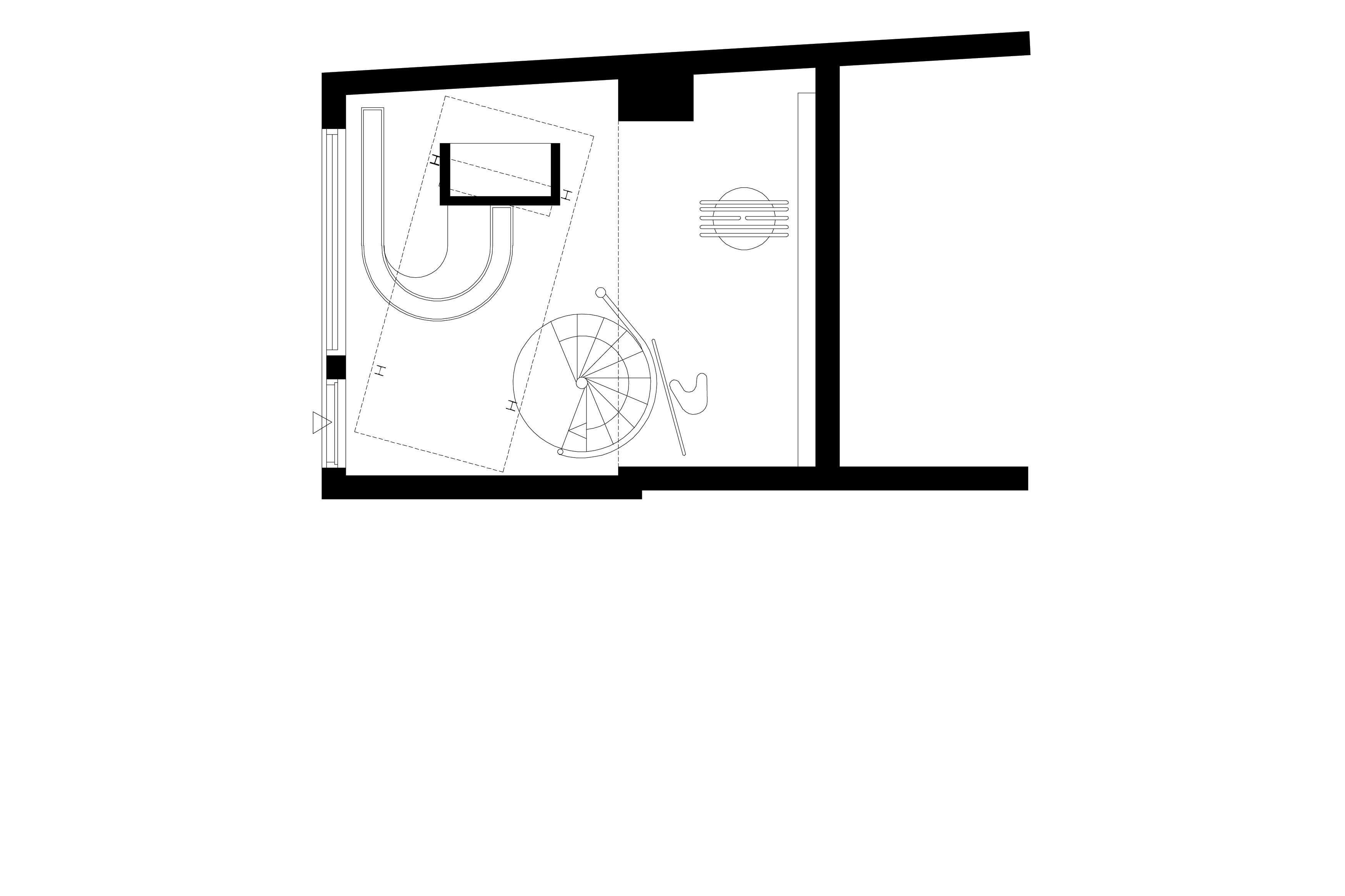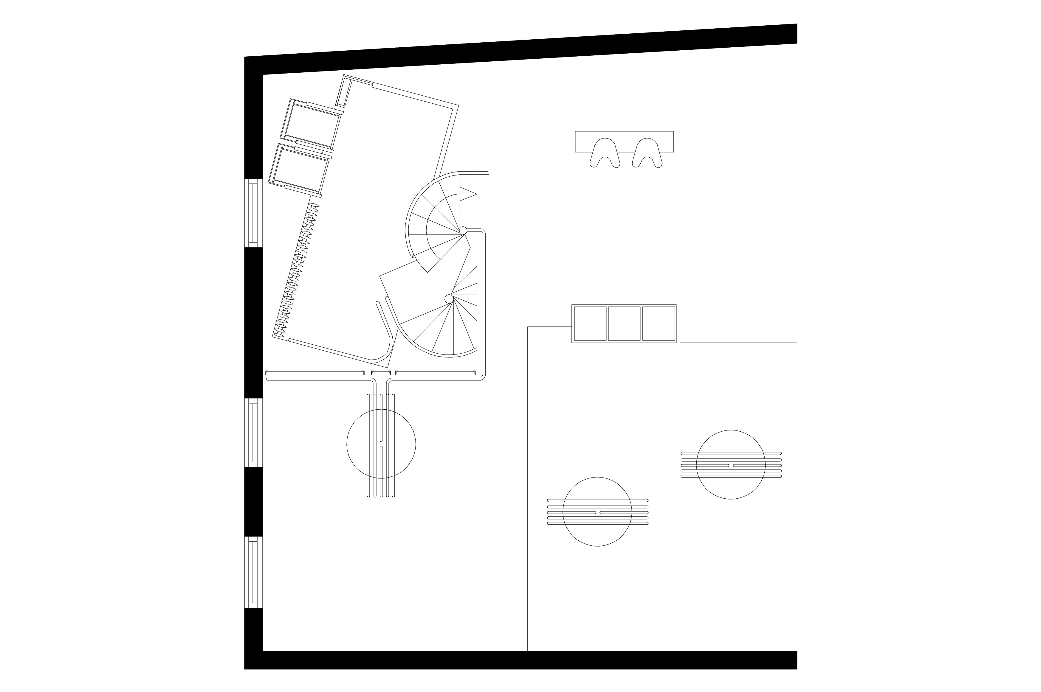 Een nieuwe trap en vide verbinden de twee niveaus. Een groot tussenbordes fungeert als wachtruimte en bemiddelt in de afstand tussen beneden en boven.
