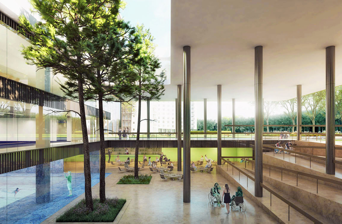 Het zorgcomplex voor Glostrup Hospital in Kopenhagen in Denemarken is compact, eenvoudig van opzet en met een heldere organisatie van functies. De onderste verdiepingen van het gebouw zijn open, transparant en publiekelijk toegankelijk. Hiermee levert het gebouw een echte meerwaarde voor de lokale gemeenschap. Een helder en direct primair circulatie systeem gecombineerd met secundaire looproutes, die de mogelijkheid geven om het gebouw dwalend te verkennen, resulteren in een efficiënt netwerk van routes en een levendig gebouw. Visuele verbindingen in het gebouw tussen de verschillende verdiepingen en functies zorgen voor een open atmosfeer, stimuleren